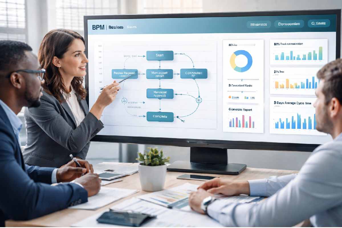 BPM (Business Process Management) software helps businesses model, automate, monitor, and improve processes like approvals, onboarding, and service workflows to boost efficiency and reduce errors. It provides visibility into operations and supports workflow optimization to meet business goals.